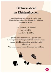 Glühweinabend Kleiderstübchen Daniela Rensen2025-10-27T09:09:49+01:0027.10.2025|Kommentare deaktiviert für Glühweinabend Kleiderstübchen Teile diesen Beitrag mit deinen Freunden! FacebookTwitterLinkedInPinterestE-Mail