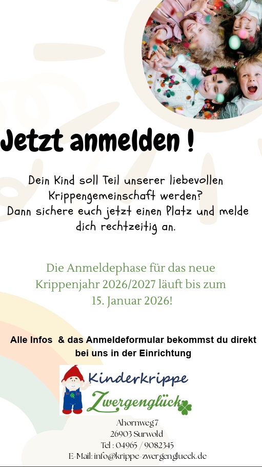 Anmeldephase für Krippenjahr 2026/2027 in der Kinderkrippe Zwergenglück Daniela Rensen2025-11-12T11:49:29+01:0012.11.2025|Allgemein, Neuigkeiten|Kommentare deaktiviert für Anmeldephase für Krippenjahr 2026/2027 in der Kinderkrippe Zwergenglück Teile diesen Beitrag mit deinen Freunden! FacebookTwitterLinkedInPinterestE-Mail Ähnliche Beiträge Anmeldetag für das KiTa-Jahr 2026/2027 in der Kita St. Josef Börgerwald Anmeldetag für das KiTa-Jahr 2026/2027 in der Kita St. Josef Börgerwald Öffentliche Gemeinderatssitzung am 18.11.2025 Öffentliche Gemeinderatssitzung am 18.11.2025 Weihnachtsgeschenke für bedürftige Kinder Weihnachtsgeschenke für bedürftige Kinder 6. Weihnachtsmarkt im Hofladen Kampen vom 21.-23.11.2025 6. Weihnachtsmarkt im Hofladen Kampen vom 21.-23.11.2025 Hinweis: Arbeiten für Schmutz- und Regenwasser am Ahornweg 16 Hinweis: Arbeiten für Schmutz- und Regenwasser am Ahornweg 16