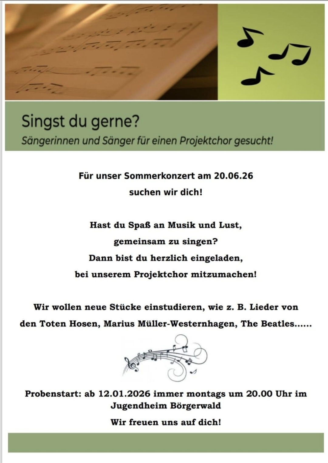 Singst du gerne? – Sängerinnen und Sänger für einen Projektchor gesucht! Daniela Rensen2026-01-12T08:42:18+01:0012.01.2026|Allgemein, Neuigkeiten|Kommentare deaktiviert für Singst du gerne? – Sängerinnen und Sänger für einen Projektchor gesucht! Teile diesen Beitrag mit deinen Freunden! FacebookTwitterLinkedInPinterestE-Mail Ähnliche Beiträge Blutspende-Aktion in Surwold am 16.01.2026 Blutspende-Aktion in Surwold am 16.01.2026 Weihnachtsverlosung 2025 – Preisverleihung Weihnachtsverlosung 2025 – Preisverleihung Kuchenbehälter vom Weihnachtsmarkt Kuchenbehälter vom Weihnachtsmarkt Anmeldephase für das Kitajahr 2026/2027 im Kindergarten Moorwichtel Anmeldephase für das Kitajahr 2026/2027 im Kindergarten Moorwichtel Anmeldephase für Krippenjahr 2026/2027 in der Kinderkrippe Zwergenglück Anmeldephase für Krippenjahr 2026/2027 in der Kinderkrippe Zwergenglück