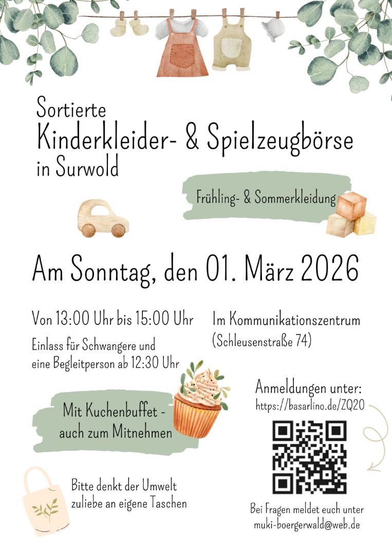 Sortierte Kinder- & Spielzeugbörse in Surwold am 01.03.2026 Daniela Rensen2026-01-19T09:09:22+01:0019.01.2026|Allgemein, Neuigkeiten|Kommentare deaktiviert für Sortierte Kinder- & Spielzeugbörse in Surwold am 01.03.2026 Teile diesen Beitrag mit deinen Freunden! FacebookTwitterLinkedInPinterestE-Mail Ähnliche Beiträge Singst du gerne? – Sängerinnen und Sänger für einen Projektchor gesucht! Singst du gerne? – Sängerinnen und Sänger für einen Projektchor gesucht! Weihnachtsverlosung 2025 – Preisverleihung Weihnachtsverlosung 2025 – Preisverleihung Kuchenbehälter vom Weihnachtsmarkt Kuchenbehälter vom Weihnachtsmarkt Anmeldephase für das Kitajahr 2026/2027 im Kindergarten Moorwichtel Anmeldephase für das Kitajahr 2026/2027 im Kindergarten Moorwichtel Anmeldetag für das KiTa-Jahr 2026/2027 in der Kita St. Josef Börgerwald Anmeldetag für das KiTa-Jahr 2026/2027 in der Kita St. Josef Börgerwald