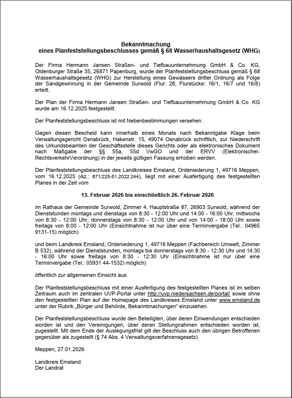 Daniela Rensen2026-01-28T09:20:12+01:0028.01.2026|Allgemein, Bekanntmachungen|Kommentare deaktiviert für Bekanntmachung des Planfeststellungsbeschlusses Hermann Jansen Straßen- und Tiefbauunternehmung
