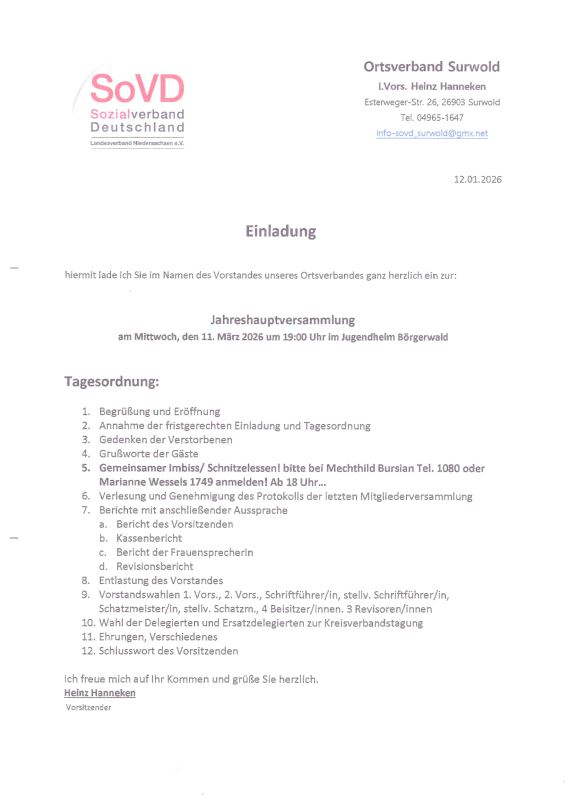 Jahreshauptversammlung SoVD am 11.03.2026 Daniela Rensen2026-02-09T11:46:49+01:0009.02.2026|Allgemein, Neuigkeiten|Kommentare deaktiviert für Jahreshauptversammlung SoVD am 11.03.2026 Teile diesen Beitrag mit deinen Freunden! FacebookTwitterLinkedInPinterestE-Mail Ähnliche Beiträge Neue Gebühren für Personalausweise ab 7. Februar 2026 Neue Gebühren für Personalausweise ab 7. Februar 2026 Bekanntmachung des Planfeststellungsbeschlusses Hermann Jansen Straßen- und Tiefbauunternehmung Bekanntmachung des Planfeststellungsbeschlusses Hermann Jansen Straßen- und Tiefbauunternehmung 6. Surwolder Plogging-Aktion am 07.03.2026 6. Surwolder Plogging-Aktion am 07.03.2026 Kinder Karneval Börgerwald Kinder Karneval Börgerwald Öffentliche Bekanntmachung Preiserhöhungen des Wasserverbandes Hümmling zum 01.01.2026 Öffentliche Bekanntmachung Preiserhöhungen des Wasserverbandes Hümmling zum 01.01.2026