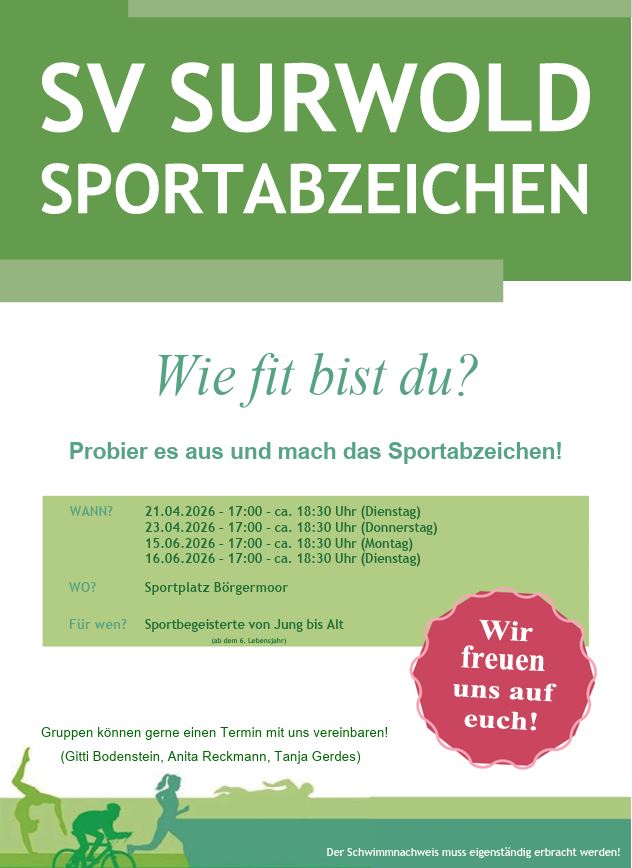 SV Surwold Sportabzeichen – Wie fit bist du? Daniela Rensen2026-03-10T09:09:13+01:0010.03.2026|Allgemein, Neuigkeiten|Kommentare deaktiviert für SV Surwold Sportabzeichen – Wie fit bist du? Teile diesen Beitrag mit deinen Freunden! FacebookTwitterLinkedInPinterestE-Mail Ähnliche Beiträge Osterfeuer 2026 Osterfeuer 2026 16. Anradeln im Emsland – Sternfahrten führen zum Anradel-Fest 2026 nach Twist 16. Anradeln im Emsland – Sternfahrten führen zum Anradel-Fest 2026 nach Twist Jahreshauptversammlung SoVD am 11.03.2026 Jahreshauptversammlung SoVD am 11.03.2026 Neue Gebühren für Personalausweise ab 7. Februar 2026 Neue Gebühren für Personalausweise ab 7. Februar 2026 Öffentliche Bekanntmachung Preiserhöhungen des Wasserverbandes Hümmling zum 01.01.2026 Öffentliche Bekanntmachung Preiserhöhungen des Wasserverbandes Hümmling zum 01.01.2026