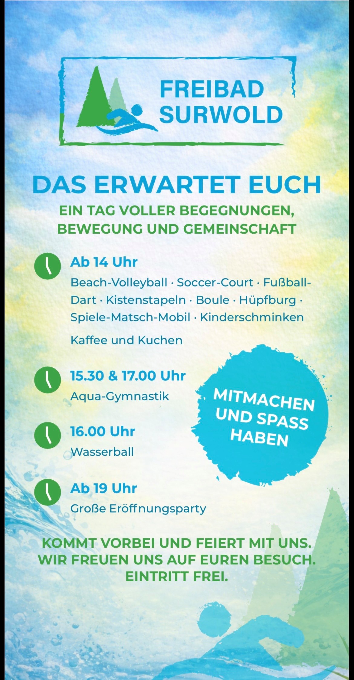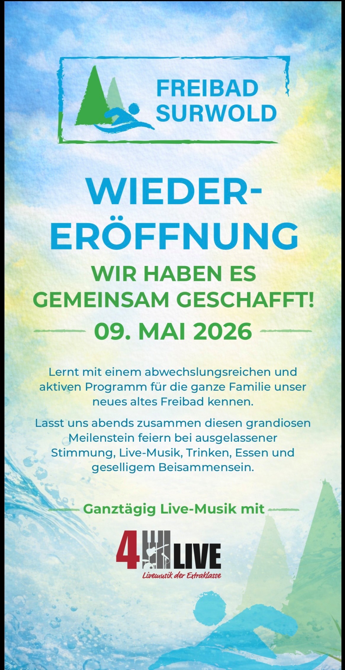 Wiedereröffnung Freibad Surwold am 09.05.2026 Daniela Rensen2026-04-08T09:46:12+02:0008.04.2026|Allgemein, Neuigkeiten|Kommentare deaktiviert für Wiedereröffnung Freibad Surwold am 09.05.2026 Teile diesen Beitrag mit deinen Freunden! FacebookTwitterLinkedInPinterestE-Mail Ähnliche Beiträge Bekanntmachung Aufstellung B-Plan Nr.: 25a „Prüfgelände I“ der Gemeinde Surwold Bekanntmachung Aufstellung B-Plan Nr.: 25a „Prüfgelände I“ der Gemeinde Surwold Theaterabend in Surwold „Achtsam morgen“ am 18.04.2026 Theaterabend in Surwold „Achtsam morgen“ am 18.04.2026 Tag der offenen Tür im Kindergarten Moorwichtel Tag der offenen Tür im Kindergarten Moorwichtel 6. Surwolder Plogging Umwelt-Aktion – Wir sagen DANKE! 6. Surwolder Plogging Umwelt-Aktion – Wir sagen DANKE! SV Surwold Sportabzeichen – Wie fit bist du? SV Surwold Sportabzeichen – Wie fit bist du?