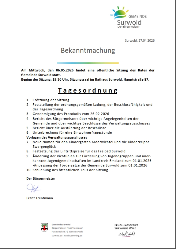Öffentliche Gemeinderatssitzung am 06.05.2026 Daniela Rensen2026-04-27T12:40:19+02:0027.04.2026|Allgemein, Bekanntmachungen, Neuigkeiten|Kommentare deaktiviert für Öffentliche Gemeinderatssitzung am 06.05.2026 Teile diesen Beitrag mit deinen Freunden! FacebookTwitterLinkedInPinterestE-Mail Ähnliche Beiträge Einladung Mitgliederversammlung Förderverein Grundschule und Kindergarten St. Josef Börgerwald Einladung Mitgliederversammlung Förderverein Grundschule und Kindergarten St. Josef Börgerwald Kirchenchor Börgerwald präsentiert ein stimmungsvolles Konzert am 20./21.06.2026 Kirchenchor Börgerwald präsentiert ein stimmungsvolles Konzert am 20./21.06.2026 SV Surwold -> Betreuer/innen gesucht! Kindersportangebot für alle Grundschulkinder SV Surwold -> Betreuer/innen gesucht! Kindersportangebot für alle Grundschulkinder Wiedereröffnung Freibad Surwold am 09.05.2026 Wiedereröffnung Freibad Surwold am 09.05.2026 Bekanntmachung Aufstellung B-Plan Nr.: 25a „Prüfgelände I“ der Gemeinde Surwold Bekanntmachung Aufstellung B-Plan Nr.: 25a „Prüfgelände I“ der Gemeinde Surwold
